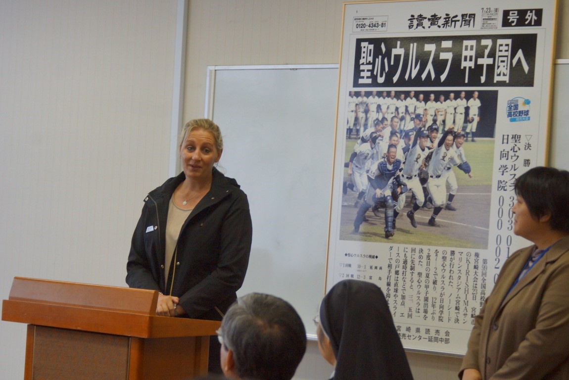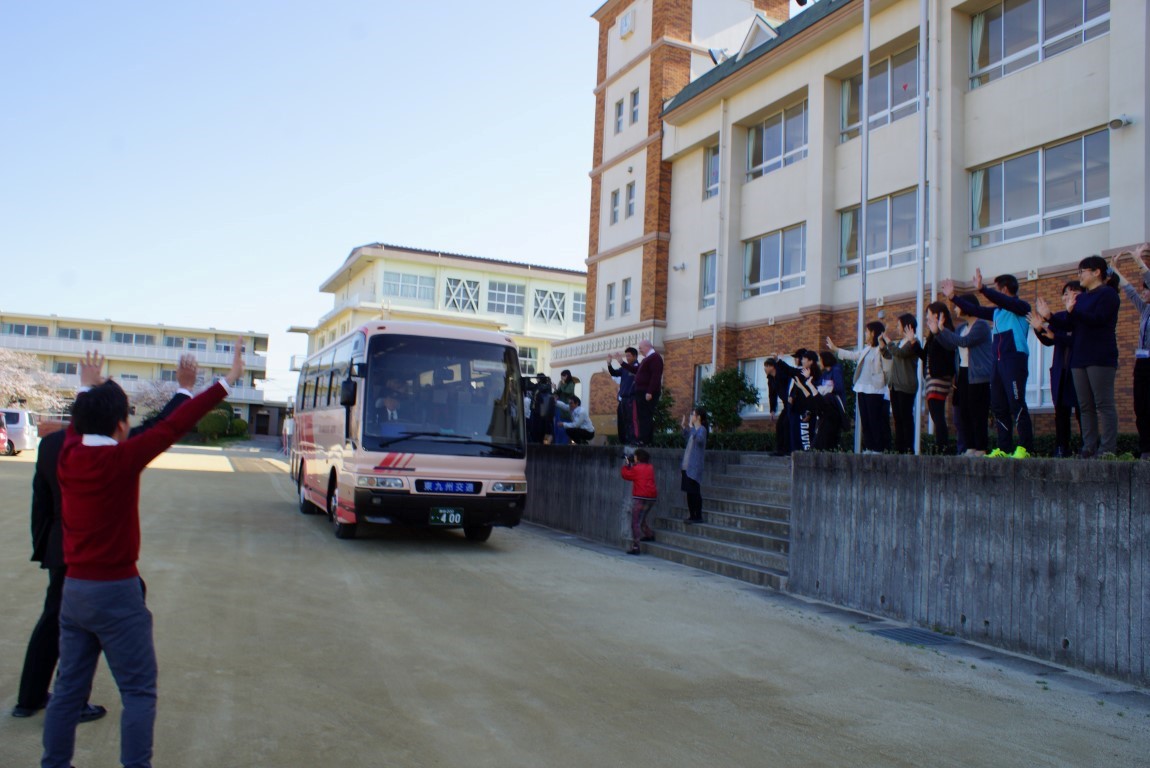 3月29日(金)は、8時10分より本校にてお別れの会がありました。昨年の甲子園出場の際にはバルコムより寄付をいただきましたので、その感謝の意をこめて本校から甲子園記念タオルとパンフレットをお渡ししました。お別れの会のあと、バルコム生がバスに乗る直前まで、別れを惜しみました。
