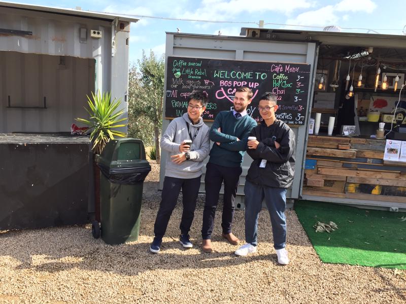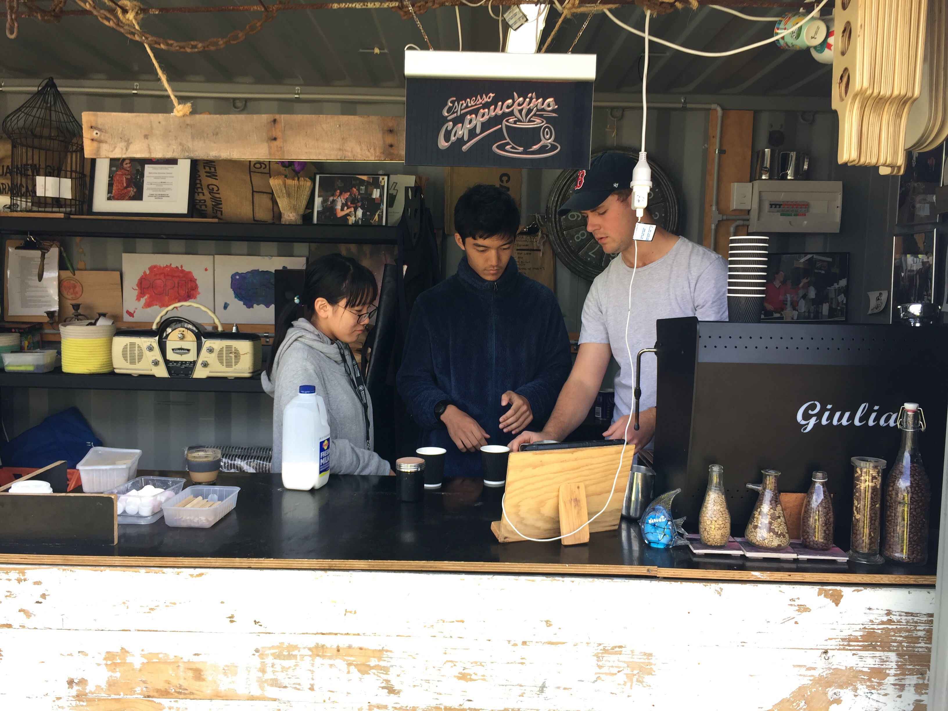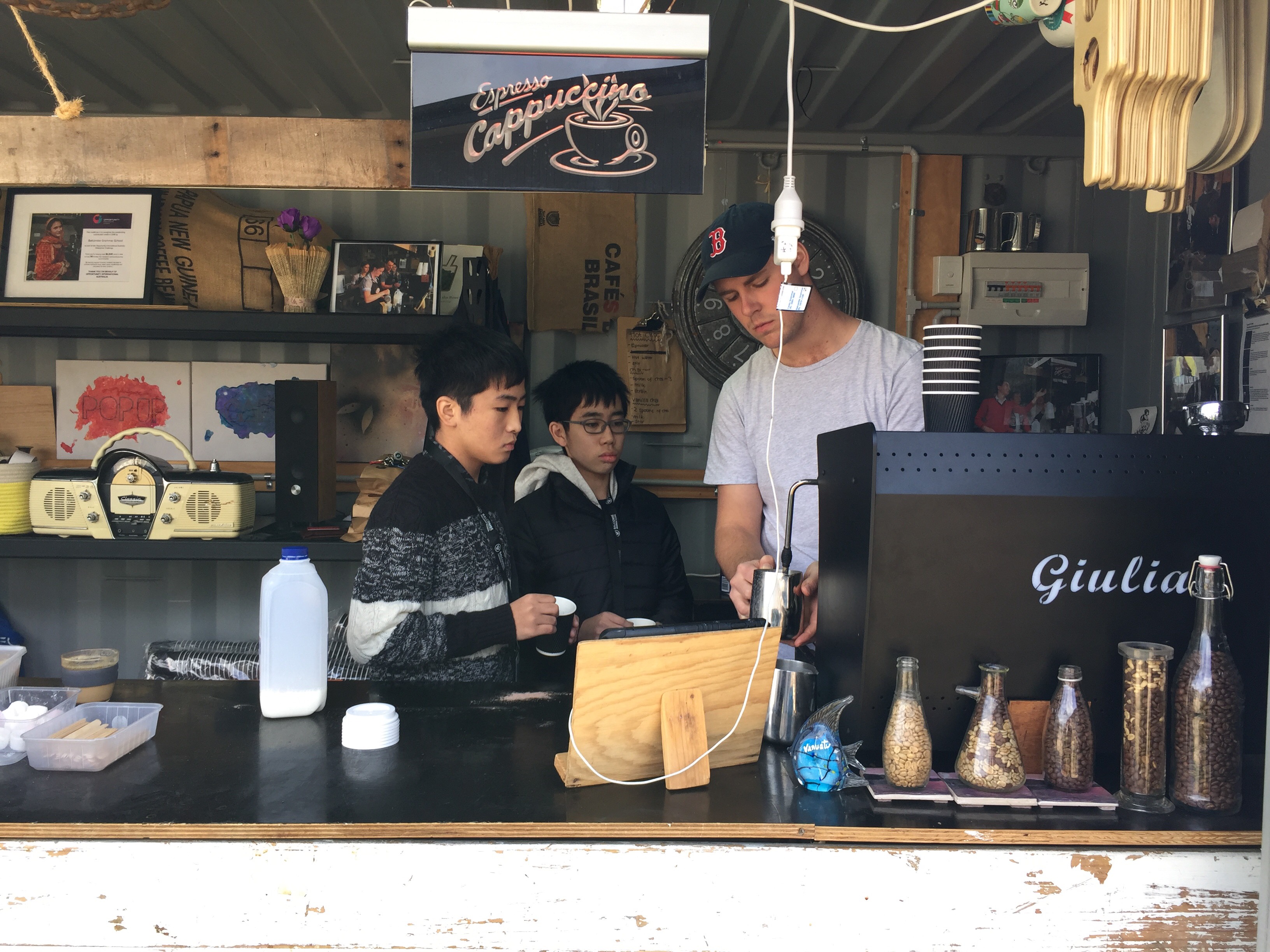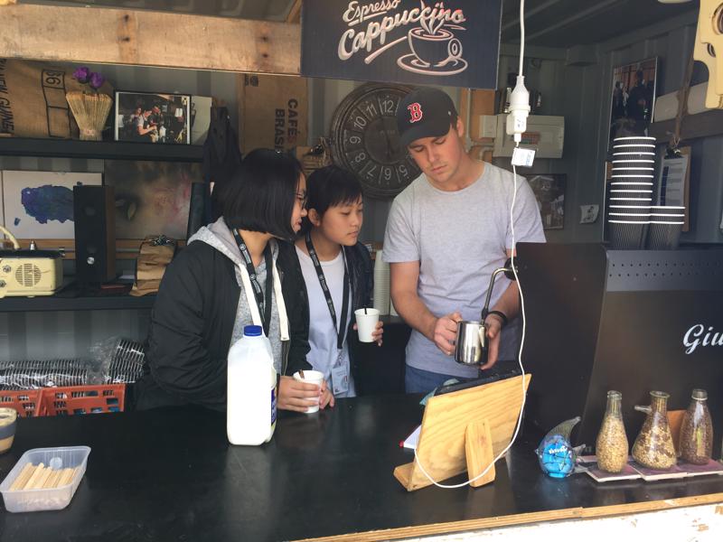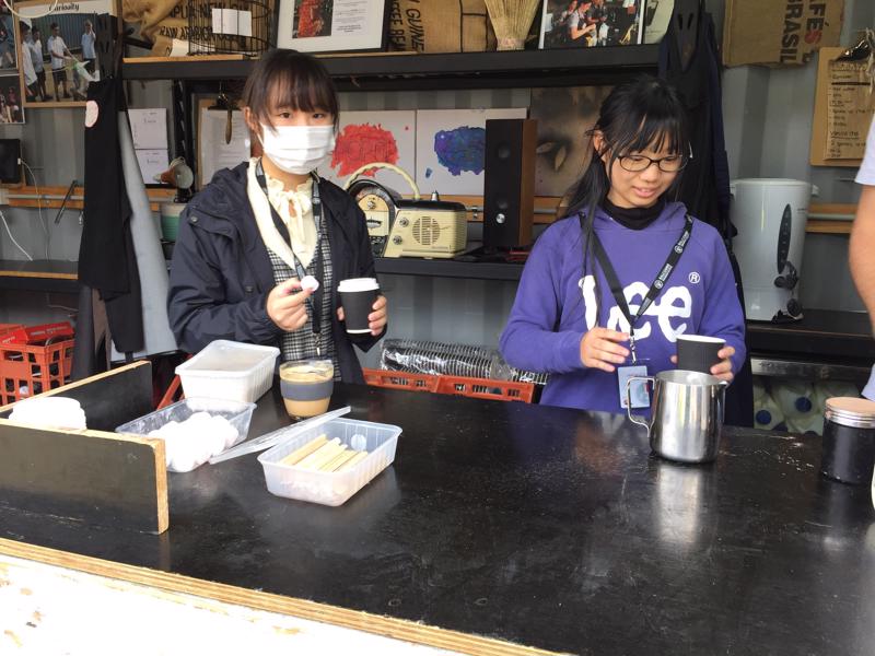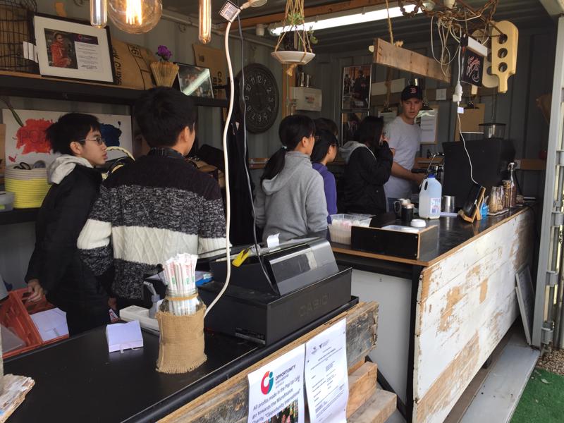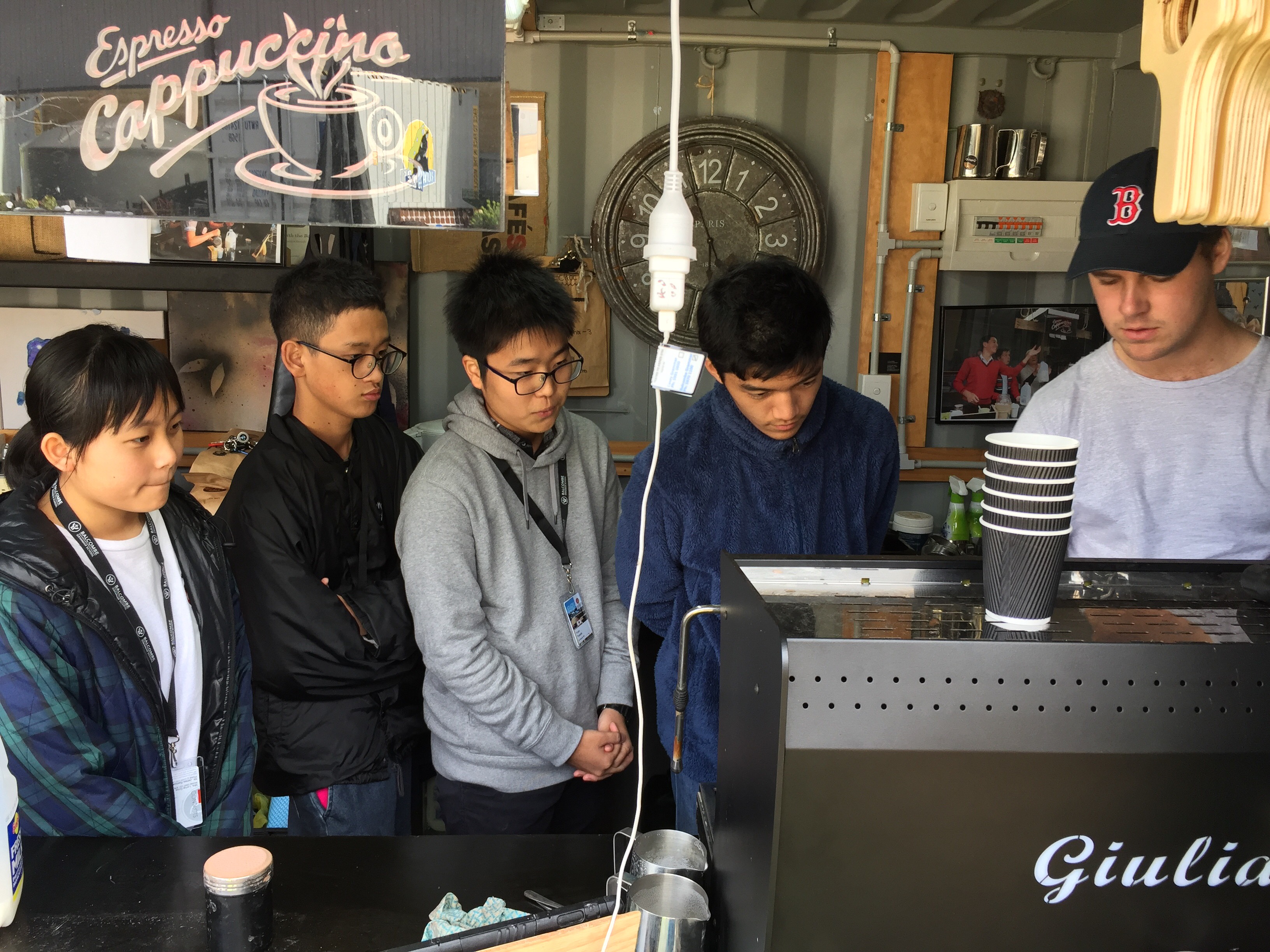 ホームステイ3日目。今日はまず、バルコム校内にあるカフェで、コーヒーを作る体験をしました。寒かったこともあり、コーヒーよりホットチョコが人気でした。