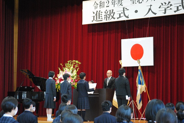 感染症の拡大防止のため、生徒職員全員マスク着用の上、新入生とその保護者、職員のみでの入学式となりましたが、新入生進級生合わせて245名が元気に入場し、校長先生より入学・進級の許可をいただきました。