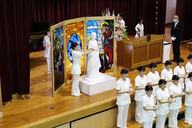 宣誓式では、生徒一人ひとりがナイチンゲール像から火を受け取り、全員でナイチンゲール誓詞を唱えました。大きな声で唱えられたナイチンゲール誓詞からは、決意の固さが伝わってきました。