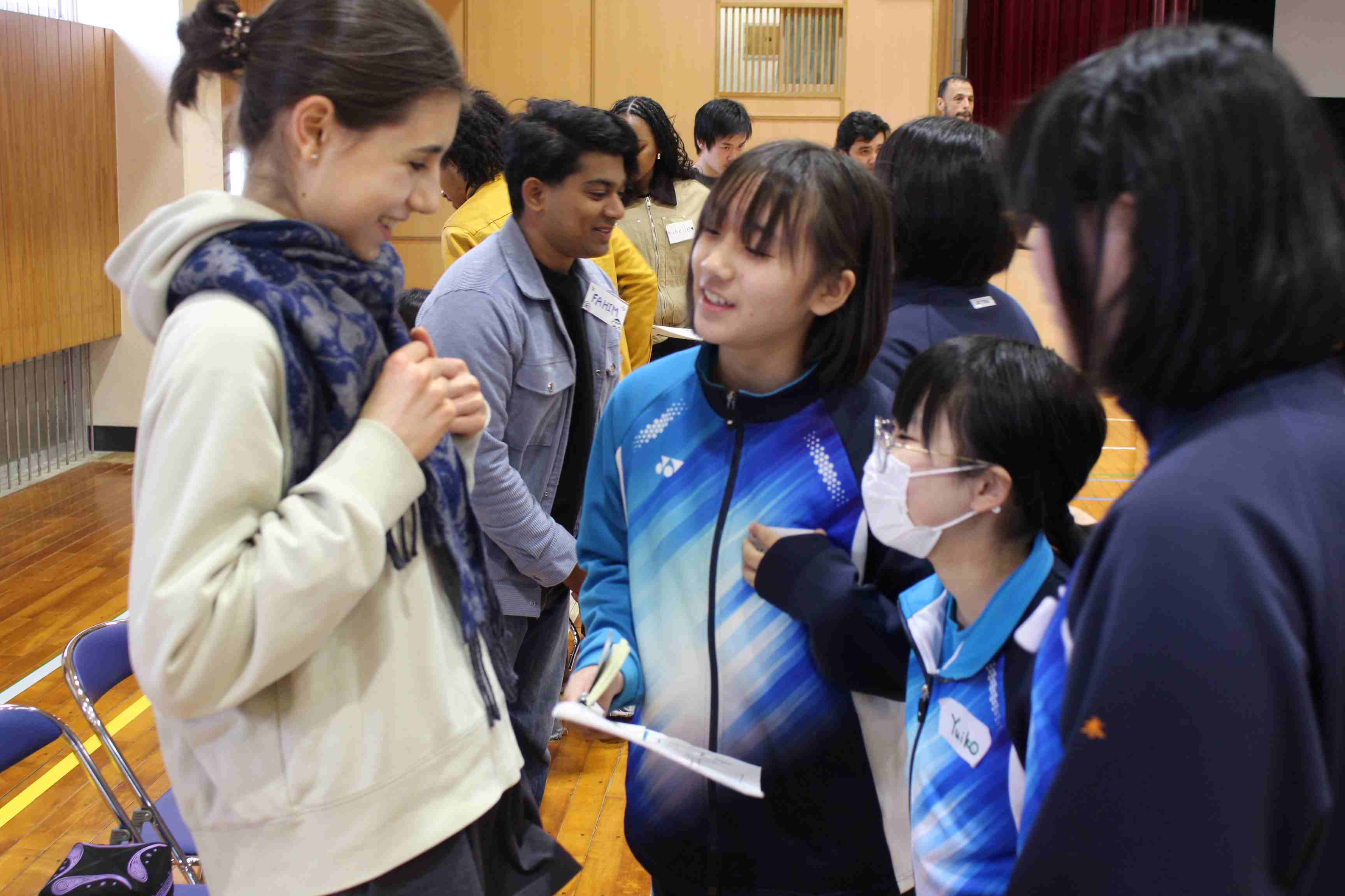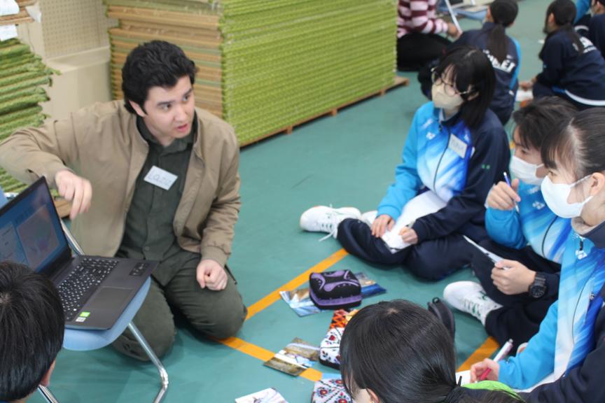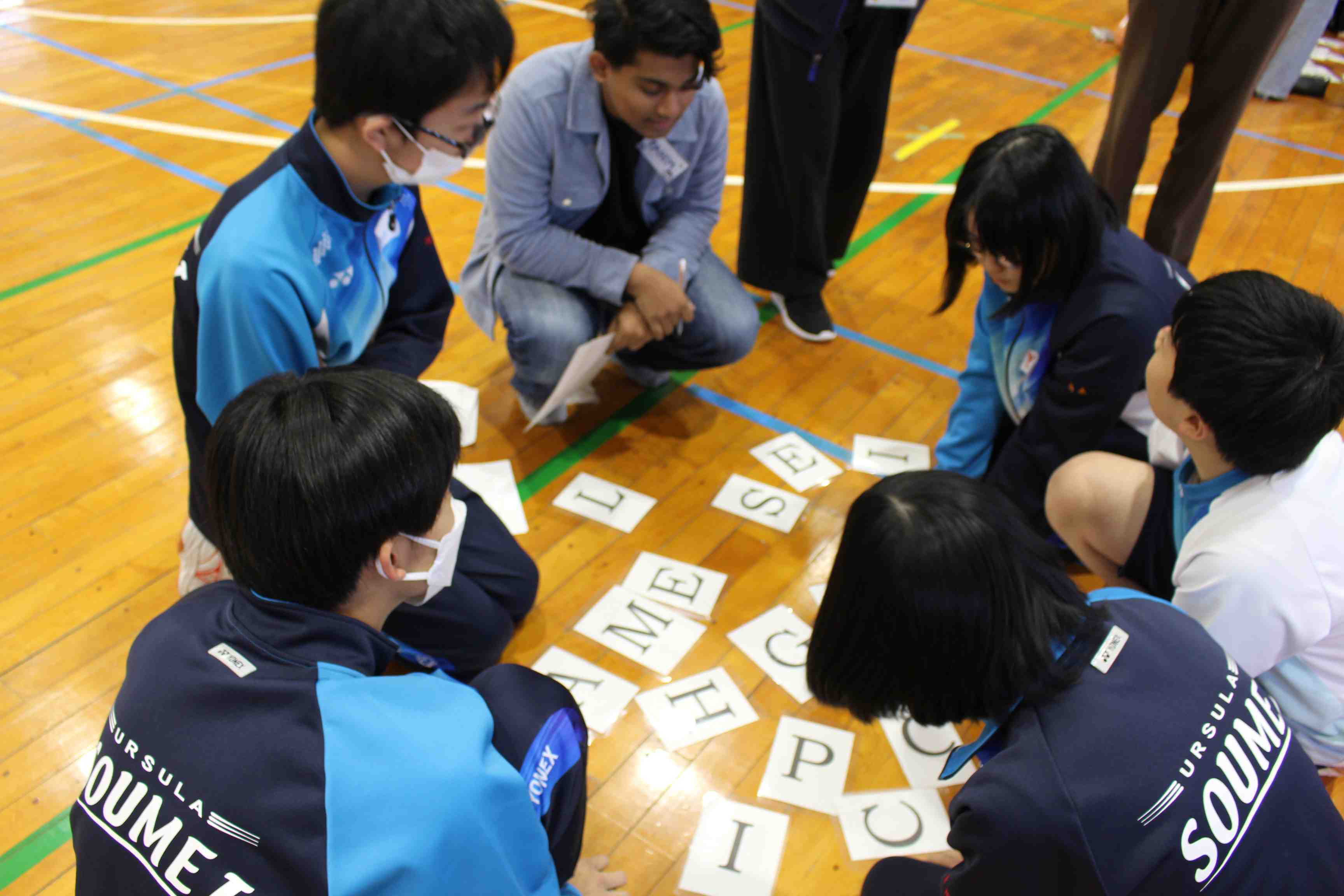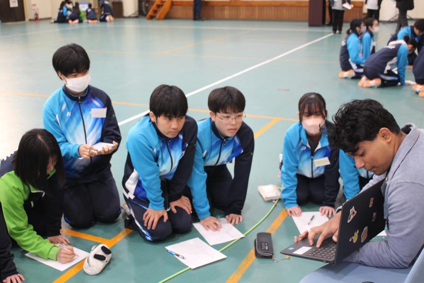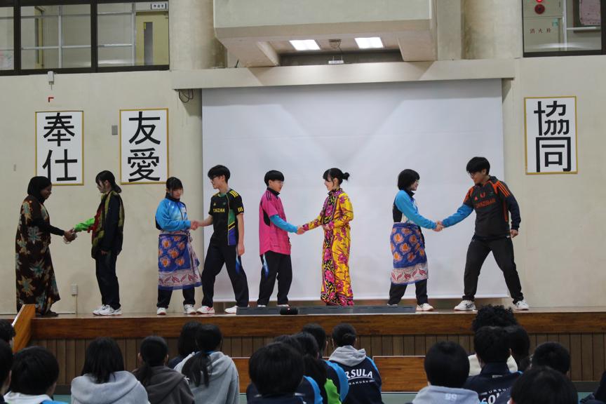 1日目は中学1・2年生を対象に、縦割りグループでの活動を実施しました。留学生による各国紹介の後、英語を使ったアクティビティに取り組みました。最初は緊張している様子でしたが、休み時間には留学生に話しかけに行くなどの積極的な姿が見られました。